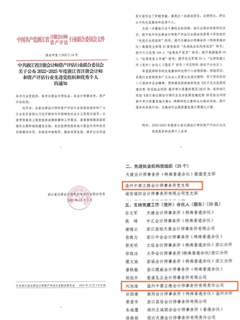 近日,中共浙江省注冊會計師資產評估行業聯合委員會發布《關于公布2022-2025年度浙江省注冊會計師和資產評估行業先進黨組織和優秀個人的通知》(浙會評黨〔2025〕18號),對近年來浙江省行業內涌現出的先進黨組織與優秀個人進行表彰。中源立德所黨支部與主任會計師劉旭海光榮上榜,獲得多項榮譽。